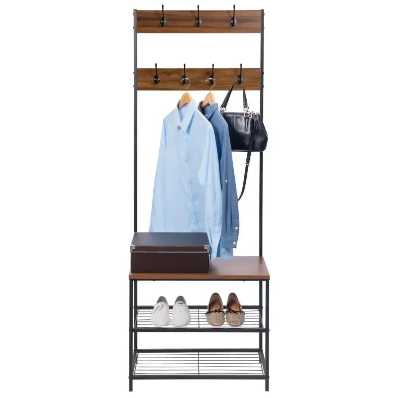 BukkitBow - Metalen Kapstok - Met Schoenenrek – Industriële Kapstok – Staand – Bruin Hout & Zwart Metaal